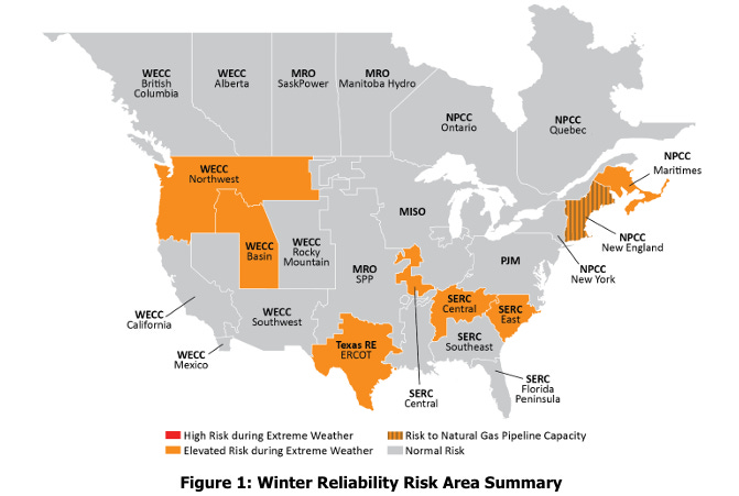 As I mentioned, NERC found an elevated risk of blackouts this winter for several regions of the US. However, the potential for blackouts affects fewer states and mostly different regions than the ones FERC determined were at an elevated risk last summer. The following map from NERC’s assessment shows where NERC thinks problems might arise this winter.